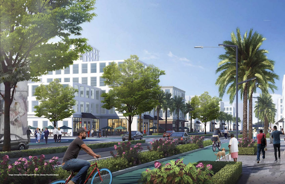 The development will be “the first truly viable alternative to automobile commuting,”. Upland Park is being purpose-built for integration with the upcoming east-west transit corridor, according to the developer. The community will have expedited access to major employment areas such as Miami International Airport, the Health District, Downtown and Brickell, the developer says. The project site itself is at the planned Dolphin rapid transit station. [caption id="attachment_27290" align="aligncenter" width="1290"] A rendering released by Miami-Dade County showing the BRT service planned on the east-west corridor of the SMART plan[/caption]Once inside the community, residents and workers will enjoy a master-planned walkable neighborhood with built-in traffic solutions, along with resiliency features. The goal is to also have a variety of residence sizes and price points within the neighborhood, catering to “all ages and audiences,” from students to seniors.