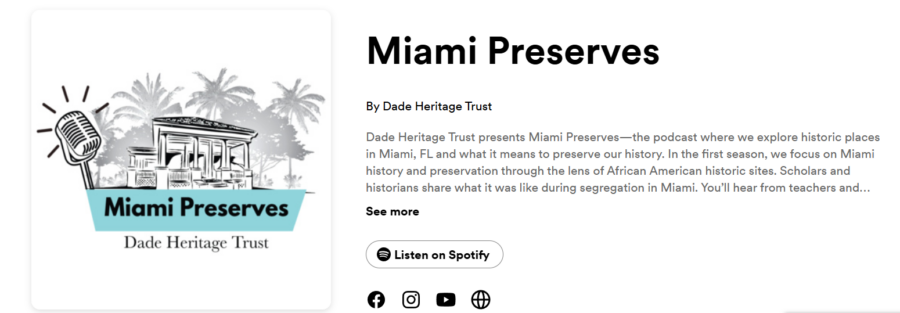 Dade Heritage Trust (DHT) proudly announces the launch of its new podcast, "Miami Preserves." This podcast, produced in collaboration with DHT’s Historic Places, Green Spaces education program, delves into the rich tapestry of Black history in Miami. Through captivating interviews and archival recordings, "Miami Preserves" illuminates the stories, struggles, and achievements of the African American community in this vibrant city.Inaugural Episode and Series LaunchThe inaugural episode features our very own Historical Preservation Specialist, Megan Mclaughlin. Listen to this insightful discussion on America's African American history, kicking off a content-rich four-part series. The trailer for this eagerly anticipated series has already been released, generating excitement for the first episode, which will be available on all major podcast platforms starting June 26, 2024.Listen and SubscribeListeners can access the trailer and subscribe to "Miami Preserves" here. This series aims to celebrate Miami’s African American cultural heritage, preserving and honoring the community's significant contributions to the city’s history and identity.Join the JourneyJoin DHT on this compelling journey as "Miami Preserves" brings to life the stories that have shaped the African American experience in Miami. Don't miss this unique opportunity to connect with the past and celebrate the vibrant cultural heritage that continues to enrich the city.