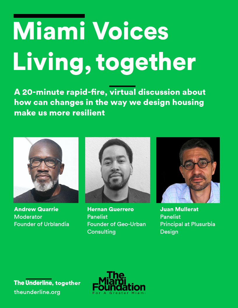 Plusurbia's Juan Mullerat is excited to be a part of Friends of The Underline's fifth Miami Voices virtual discussion, Miami Voices Living, together next week. See below for more info!Miami Voices Living, togetherWed Jul 29, 1:00 p.m.Tune in at 1 PM on Wednesday, July 29th for our fifth Miami Voices episode: Living, together, a 20-minute rapid-fire, virtual discussion about how can changes in the way we design housing make us more resilient.--Moderated by Andrew Quarrie, founder, Urblandia, guests Juan Mullerat, founding principal, Plusurbia Design, and Hernan Guerrero, founder, Geo-Urban Consulting.--About Miami Voices: From a global pandemic to racial equity, the past 4 months have tested the resiliency of communities throughout the world while forcing us to look at critical issues. These issues are wide-ranging from public health, to affordability, equity, and mobility. How will we respond to these issues? Will we change our behaviors long term? And is there the possibility of a silver lining?--Each week we will discuss a different topic with community leaders and subject experts talking about Miami and change. Miami Voices is a free, pre-recorded program produced by Friends of The Underline and aired on Facebook Live.--Also, Miami Voices is brought to you by the Friends of The Underline team. Our goal is to help build a stronger community with people-focused, authentic, and organic conversations that empower, engage, and connect. Sign up here to watch:Register