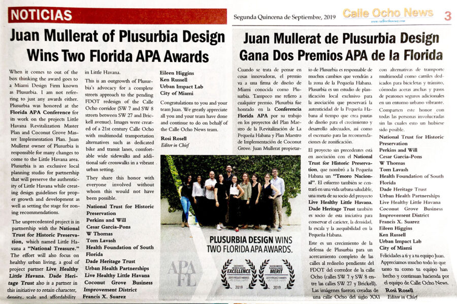 PlusUrbia's Juan Mullerat was honored to have received the 2019 Honor Award from the Livable Cities Conference on behalf of the National Trust for Historic Preservation and PlusUrbia Design Team for the Little Havana Me Importa Revitalization Plan with the City of Miami and The Health Foundation of South Florida.