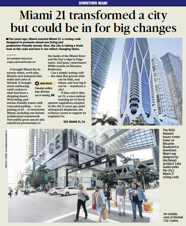 BY ANDRES VIGLUCCIJUNE 14, 2020 06:00 AM [caption id="attachment_4104" align="alignnone" width="960"] An outside view of Brickell City Centre in Miami, Florida on Tuesday, January 7, 2020. MATIAS J. OCNER MOCNER@MIAMIHERALD.COM[/caption]It brought Miami the intensely urban, work-play lifestyle and animated sidewalks and cafes of Brickell. It brought street-embracing retail centers to what had been a shopping desert. Welcoming, pedestrian-friendly towers with concealed parking — or no parking at all — to downtown Miami, including one instant architectural masterwork. New public green spaces and waterfront promenades to the banks of the Miami River and the bay’s edge in Edgewater. And jazzy, rejuvenated MiMo motels on Biscayne Boulevard.Can a simple zoning code — the rules that govern what can be built, and where, and how big it can be — transform a city?If that code is Miami 21, a once-radical-seeming set of development regulations adopted by the city 11 years ago amid widespread skepticism, the evidence seems to support an emphatic Yes.Now, just over a decade on, the city is undertaking a fresh look at Miami 21. This week, after a five-month delay caused by the COVID-19 pandemic, the city formally launched a special task force of experts and residents charged with substantially revising the code and tackling new goals that weren’t on the front burner when it was enacted in 2009.Chief among those: Finding ways to promote development of critically needed affordable housing, figuring out new rules for developing projects to meet sea-level rise, reviewing the adequacy of existing zoning for specific city neighborhoods, and addressing issues of equity and gentrification that Miami 21 may have inadvertently helped fuel.Almost certainly, the task force’s 12 members — a mix of architects and planners, developers, land-use lawyers and residents — will wrestle with how, or whether, to limit the massive and sometimes controversial Miami 21 Special Area Plan projects that have become flashpoints of community opposition.Although the city’s planning board last year called for doing away with the so-called SAPs entirely, city officials want to refine them. Experts say that could be done by increasing community participation while curbing density or building heights to ensure the projects are compatible with surrounding neighborhoods.[caption id="attachment_4106" align="alignnone" width="960"] A Starbucks on the ground floor of a residential building in Miami’s Brickell neighborhood opens directly to the sidewalk in pedestrian-friendly fashion under a template set by the city’s 10-year-old Miami 21 zoning code. CHARLES TRAINOR JR CTRAINOR@MIAMIHERALD.COM[/caption]SAPs have won both praise and scorn.The SAP section of Miami 21 was intended to sensitively guide large-scale development on at least nine acres through negotiations between developers and city planners. It led to the creation of the Brickell City Centre, the shopping, hotel, office and residential complex on several blocks of long-vacant land on the south side of the Miami River. It also allowed the transformation of the once-forlorn Miami Design District into an uber-luxury, pedestrian-friendly urban shopping and cultural district. But distressed, low-income Little Haiti could end up sandwiched in between two mammoth, not-yet-built SAP developments that have already been blamed for rampant land speculation, rising residential rents and small-business evictions in the neighborhood.Although the Miami 21 code has been amended several times, the city has not conducted the sort of thorough assessment that its designers at the Miami planning firm Duany Plater-Zyberk envisioned would occur every few years to adapt to a changing world.“The city has evolved tremendously since the inception of Miami 21,” Miami City Manager Art Noriega told the task force during the inaugural meeting, which was conducted virtually. “This is something we probably should have started some time back.”Under a resolution adopted by the Miami commission, the task force will meet at least monthly and issue a report with recommended revisions or additions by December to city commissioners.The questions the task force should explore, say its members and Miami 21 principal author Elizabeth Plater-Zyberk, take on added dimensions in the ongoing COVID-19 pandemic.One consideration: should the prospect of subsequent waves of infection or new epidemics justify requirements for greater setbacks and open space at the street level around buildings? That requirement would allow for maximum air circulation and space for social distancing, including separated cafe tables and wider sidewalks, they said.Another factor: Will decreased use of formal offices, or a greater need for working from home, produce a greater need for live-work housing that combines residential space with businesses or office space?Even questions over the continued desirability of increased urban density to foster city life should be on the table after coronavirus spread rapidly in close urban quarters like New York City, they say.“Wider sidewalks and fewer or narrower traffic lanes, wellness and equity questions, and rethinking of public space — the amount of it, the dimensions of it — would certainly be appropriate in light of world health,” said Plater-Zyberk. She stressed she has not kept up with the code’s use closely and is not involved in the revision effort.When it comes to affordable housing, there’s only so much a zoning code can do to spur affordable housing short of requiring it — something elected officials have resisted and may now be barred by a new state statute, experts say. Plater-Zyberk said Miami 21 could nonetheless provide greater incentives than it does now to developers. It could offer more capacity to build in exchange for strict commitments to including affordable or workforce housing in projects — though she warned those must be ca