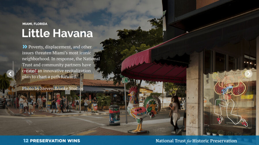 November 18, 2019   More:We're Saving Places   By:Julia Rocchi  Thanks to supporters and advocates like you, we at the National Trust are celebrating a year with wide-ranging victories, from hands-on work that enlivened old buildings, to legal successes that strengthened protection, to creative thinking that re-interpreted, re-imagined, and re-invigorated places telling America’s full history.To mark the occasion, we’re spotlighting 12 of our proudest preservation moments that epitomize our movement’s dedication and determination—and they’re all made possible by your support.8. Little HavanaMiami, FloridaAn international symbol of the role of immigrants in the American story, Little Havana—named a National Treasure in 2017—is Miami’s most iconic neighborhood. Yet poverty, displacement, and other issues threaten this vibrant community, prompting the National Trust to create a road map for improving life for Little Havana’s residents while protecting this one-of-a-kind place.In partnership with local organizations led by PlusUrbia Design, and developed with input from more than 2,700 residents, stakeholders, and public health advocates, the award-winning revitalization plan focuses on building a healthy, equitable, and resilient neighborhood that retains its unique character. Drawing on best practices from a variety of fields, the plan increases incentives, lowers barriers, and respects the existing heritage of Little Havana. With this innovative tool in hand, Little Havana now has a path forward that will help future generations continue to thrive.