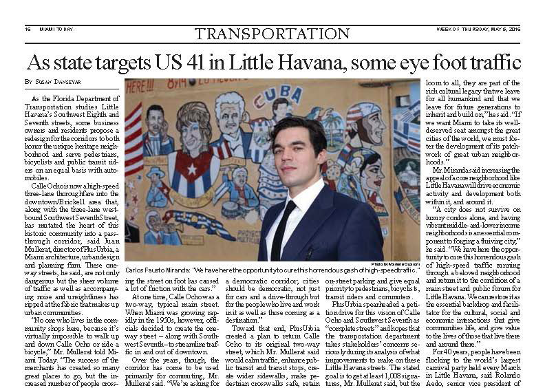 BY JUAN MULLERAT and STEVE WRIGHT From the beginning of urbanized America, streets functioned to provide mobility in many ways:People walked to work, trolley, horse-drawn then powered moved workers from factories and offices to home. Trains played a role in commutes. Bicycles incited a pedal power mobility craze for a while.Then the automobile came along. By the 1950s, roads became the sole domain of automobiles. The automotive industry even created the term “jay walking” and launched a campaign to demonize people on foot. Sidewalks shrunk and beautifully landscaped medians were torn out to create more lanes for automobiles.Trolley lines were ripped out and replaced with buses. But buses were devalued and branded as last ditch transportation for the unfortunate. Only the sedan was fit for the upwardly mobile middle class American. Crosswalks were diminished. Those brazen enough to move around on two feet were seen as merely an impediment to moving more cars faster.Government loans encouraged suburban single family homebuilding, giving rise to the super highway, and when highways weren’t enough, surface streets – even the most picturesque and historic – were overhauled to turn them into another layer of de facto highways.After a half century of destroying hundreds of urban corridors for the sake of the almighty automobile, sanity started to creep back into the minds of elected officials, town planners and constituents.Milwaukee, San Francisco and other major cities razed elevated highways that had torn apart their urban fabric. Boston paid billions to put its in-town highway underground, with acres of urban park space and connectivity built above. Miami, which consistently and tragically ranks near the top of annual lists of the most deadly cities for pedestrians in America, is slow to offer options for pedestrians, bicyclists, public transit riders, wheelchair users and others who do not wish to be beholden the automobile.Construction for I-95 tore apart the city’s historic community. Car dependence reigns supreme despite tens of thousands of dwelling units being built in what should be a walkable urban core. Because Miami grew up in the car age, its commute times are among the longest in America.Something has to give.Miami’s PlusUrbia Design, a design practice dedicated to creating better places, is trying to undo car culture chaos in its hometown. The studio, known for its acclaimed Wynwood Neighborhood Revitalization District plan, is working to save Miami’s best-known street.Calle Ocho, the heart of Little Havana, functions as a high-speed highway into Downtown Miami and Brickell, its financial district. Two PlusUrbia team members, who each live in historic homes just blocks from Calle Ocho, have dubbed the dangerous road “Highway Ocho.” For half a century, Calle Ocho (SW 8th Street) has served as an eastbound speedway for commuters, along with the equally dangerous one-way, three-lane, westbound SW 7th Street. It is time to make streets for the people, not simply for cars.Originally a two-way typical American main street, Calle 8 was transformed in the late 60s into commuter highway. A few years later, the nearby Dolphin Expressway (I-836) was completed. Despite the opening of an elevated east-west speedway into downtown, Calle Ocho's prime stretch between 27th Avenue and I-95 was never converted back into the quaint main commercial core of Little Havana.Plusurbia Design proposes to turn Calle 8 back to its original, main street self. The firm wants to calm traffic and widen sidewalks in the hopes of reversing 50 years of degraded neighborhoods and commerce left in the wake of a corridor turned freeway. PlusUrbia advocates for Calle Ocho as a destination, not as a pass-through corridor scarring one of the oldest, most authentic neighborhoods left in Miami.The Florida Department of Transportation is currently studying the SW 7th and SW 8th Street corridors. Early Little Havana community meetings have shared FDOT scenarios that seem to be more concerned with vehicle movement than people movement. PlusUrbia, with strong ties to Little Havana, wants to unlock Calle 8's potential by proposing the restoration of the original two-way traffic. The Miami-based urban design firm has created images of a 21st century Calle Ocho with multimodal transportation alternatives such as dedicated bike and transit lanes, comfortable wide sidewalks and additional safe crosswalks in a vibrant urban setting.More than 100 Little Havana stakeholders attended PlusUrbia’s October forum to share a vision for a better Calle Ocho. A diverse group of urban and transportation design experts worked interactively with the audience to empower the growing grass roots movement for calmed traffic and a better pedestrian experience on SW 7th and SW 8th streets. The overwhelming opinion of those in attendance, including three elected officials, is that Calle Ocho and SW 7th must be Complete Streets that serve pedestrians, cyclists and public transit equally with automobiles.The long effort to turn public opinion in favor of Complete Streets has gained traction. In December, Miami Mayor Tomas Regalado wrote to the head of the Florida Department of Transportation urging that the Calle Ocho Corridor be redesigned as “complete street would serve residents, visitors, merchants, arts hubs and traffic with:Wide sidewalks, safe pedestrian crosswalks, retention of all on-street parking.Calmed traffic that eliminates the three-lane, one-way configuration that encourages speeding and dangerous driving that has resulted in pedestrian fatalities in each of the past several years.Enhanced public transit, transit stops and bicycle lanes (bikes could be on SW 7th or SW 9th)A redesign that gives equal priority to pedestrians, bicyclists, transit riders and commuters, recognizing Little Havana is one of the most important cultural destinations in South Florida.From its office, on a bike lane footsteps from a commuter