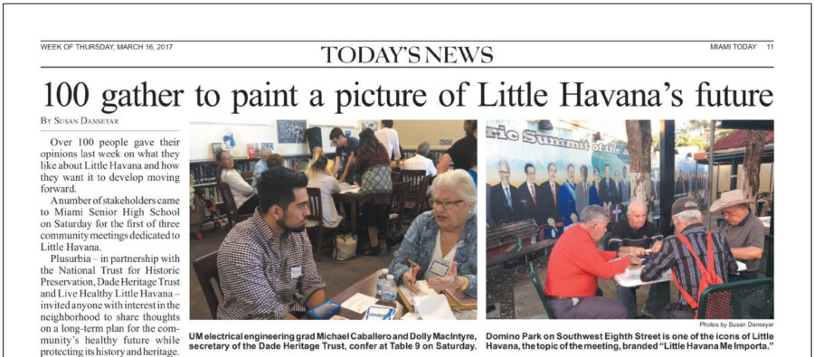 Plusurbia hopes to complete a final draft of the master plan by JulyMarch 14, 2017 12:45PMBy Francisco AlvaradoAs new development creeps into Little Havana, a master plan is in the works aimed at preserving the historic character and the pre-World War II architecture in Miami’s most famous neighborhood.On Saturday morning, more than 100 residents and merchants participated in a community workshop at Miami Senior High School to formulate big picture ideas for the master plan, which is being developed by urban planning firm Plusurbia Design in conjunction with the National Trust for Historic Preservation, Dade Heritage Trust and Live Healthy Little Havana.A majority of the participants reached consensus on restoring and reusing historic buildings, ensuring new construction is contextual and compatible with Little Havana, creating more affordable housing, community and cultural centers and making the neighborhood more pedestrian and bicycle-friendly.“At the end of the morning, we asked each table to give us their big ideas,” Megan McLaughlin, the project planning leader for Plusurbia, said. “We are going to use those to guide our reports and our suggestions to the city.”Plusurbia hopes to complete a final draft of the master plan by July, McLaughlin said. “We would present it to the city for them to consider,” she said. “The goal is to come up with heights, density, setbacks and floor lot ratios that matches what is there and is respectful of what is there.”More than a year ago, the national trust began efforts to designate Little Havana a national treasure, an honor that was officially bestowed in late January, McLaughlin said. At the time the designation was made, Live Healthy Little Havana awarded grants for the Plusurbia master plan and a streets plan being developed by Urban Health Partnerships. “The grant allows us to look at what zoning could be that is compatible with the existing neighborhood and allows healthy new development,” she said.Little Havana’s proximity to the urban core is making the neighborhood an attractive alternative for investors and developers, many buoyed by Greystar’s $89 million purchase late last year of the InTown apartment complex developed by Astor Companies. Nearby, a company controlled by Ana V. and Pedro O. Rodriguez has been approved to build a 12-story, 96-unit residential building at 45 Southwest Eighth Avenue that will also include 44,525 square feet of commercial space, 311 parking spaces and 15 bicycle parking spaces.During the workshop, PlusUrbia founder and director Juan Mullerat told attendees Little Havana hasn’t experienced the level of real estate development seen in Brickell, Edgewater and Wynwood because of the city’s zoning code, Miami 21.“Unfortunately, it has not led to much improvement in Little Havana,” Mullerat said. “We haven’t seen much investment in Little Havana, yet it is the second most dense neighborhood in Miami-Dade County.”The master plan would strike a balance between encouraging new development while giving property owners and developers incentives to preserve and renovate Little Havana’s signature three-story apartment buildings from the 1920s. “They are very unique,” Mulleret said. “You can’t find them anywhere else.”Lee Hernandez, a Little Havana homeowner since 1977, said the neighborhood needs an infusion of urbanism from Flagler Street to Northwest Fifth Street, between Northwest Fifth Avenue and Northwest 12th Avenue. “That area needs to be revitalized,” she said. “We need more greenery, we need more open spaces, and we need more places where people feel safe.”Hernandez said she would welcome rational development in Little Havana. “Developers are investing slowly, but surely,” she said. “I would like to see urbanization with consciousness. We don’t want skyscrapers. We need to keep the flavor.” Link to article: The Real DealMore information about the workshop: Little Havana Me Importa