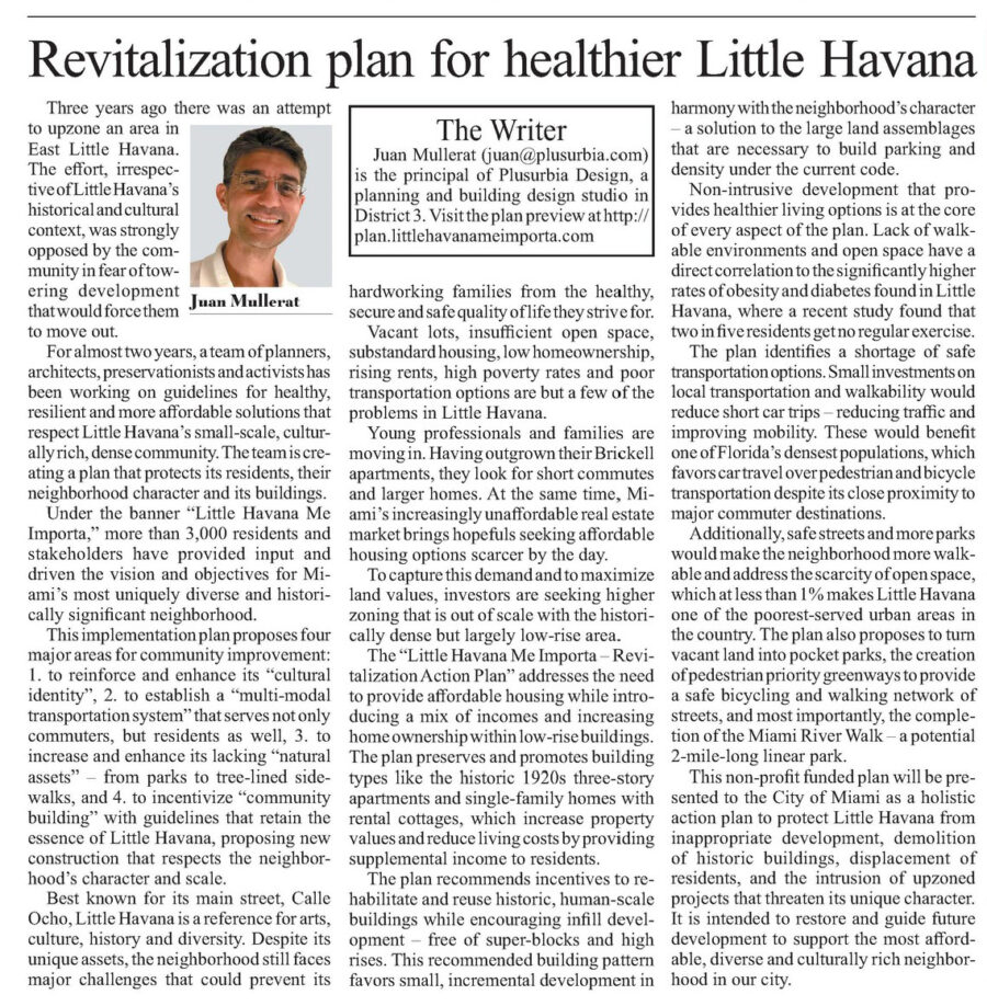 Upzoning of East Little Havana scrapped as Miami planners go back to drawing boardBY DAVID SMILEYdsmiley@miamiherald.comA view of an apartment building considered in 2015 for historic preservation in Little Havana. David Santiago El Nuevo Herald Once seemingly on the fast-track to approval, controversial legislation designed to spur growth in East Little Havana has been scrapped amid concerns that it would gentrify the storied community and displace its predominantly poor, immigrant residents.During Thursday’s meeting of the Miami Commission, city planners will nix plans to up-zone 32 blocks by withdrawing a proposal that first surfaced more than two years ago. The legislation, proffered to renew investment in a working-class neighborhood by allowing for taller, denser development, received tentative approval from Miami commissioners in early 2015. The state approved the measure but amid pushback from activists and preservationists, it disappeared from the political radar.The proposal finally resurfaced this week, only to be pulled. Francisco Garcia, Miami’s planning director, said the department concluded that the proposal still needed work, and had become too polarizing.“We found it very difficult to overcome the perception that this would result in displacement,” Garcia said.But the death of the rezoning proposal does not mean the end of efforts to jump-start development. Rather, it marks the beginning of a new direction. The neighborhood, despite pockets of vacant lots and run-down apartments, remains alluring to real estate interests.Garcia said it’s likely the city will continue to look at increasing density by considering allowing more units per acre, but pull back on discussions about increasing height. Planners also will look at new design regulations. "THERE’S A LOT OF INTEREST IN LITTLE HAVANA. IT’S MIAMI’S ELLIS ISLAND"Juan Mullerat, director of PlusUrbia“There’s a lot of interest in Little Havana. It’s Miami’s Ellis Island,” said Juan Mullerat, director of the Miami design firm PlusUrbia, which has an active interest in Little Havana. “It’s an incredible melting pot that requires a high level of attention to make sure we get right whatever it is we’re going to do there.’’A group of business owners pushing to create a Little Havana Business Improvement District would like to emulate Wynwood business owners, who with the help of PlusUrbia, created design and zoning guidelines for the neighborhood.Meanwhile, Dade Heritage Trust is pushing to expand preservation efforts in Little Havana, which is filled with dozens of notable buildings from the early- and mid-20th century. The city created the neighborhood’s first historic district in 2015; it was the same year the National Trust for Historic Preservation placed East Little Havana on its list of America’s 11 most endangered communities. Coincidentally, the city is withdrawing its up-zoning proposal one day before the National Trust, the country’s principal preservation organization, is expected to announce new involvement in the neighborhood at a press conference in Little Havana.“Any future legislation will have input from the National Historic Trust,” said Mayor Tomás Regalado, who declined to discuss the details of Friday’s event.Going forward, Garcia said his department will continue to study the area to draw up new regulations. City planners will also monitor the results of new city legislation that, if approved next month, would allow developers who set aside affordable housing residential units to potentially double the number of units allowed.“We thought all would be better served by postponing the up-zoning, and reining it in through an appropriate set of design standards and guidelines,” said Garcia. “We’re going to give this a chance and see how it develops.”Read more here:http://www.miamiherald.com/news/local/community/miami-dade/little-havana/article128557334.html#storylink=cpy