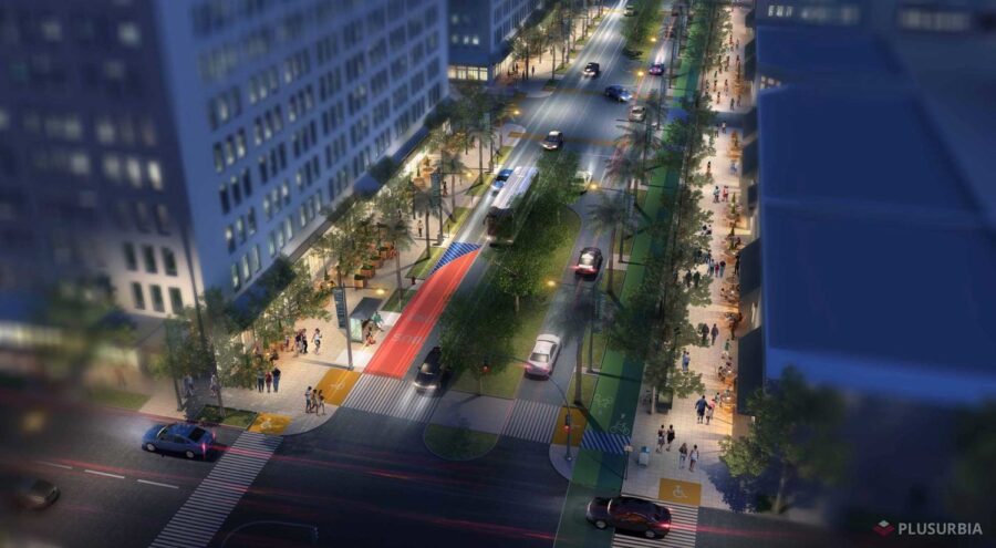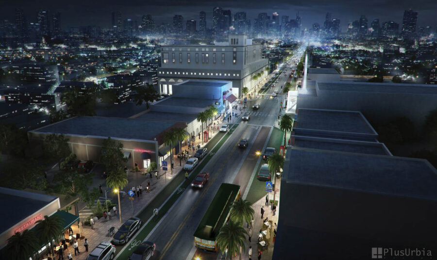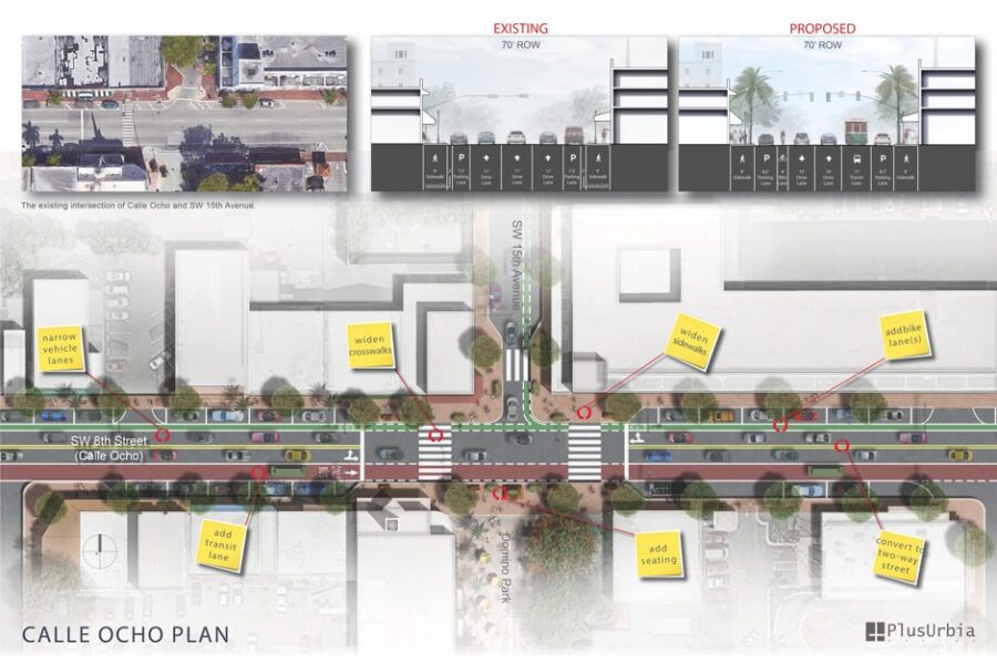 By PlusUrbia Design //From the beginning of urbanized America, streets functioned to provide mobility in many ways:People walked to work, trolley, horse-drawn then powered moved workers from factories and offices to home. Trains played a role in commutes. Bicycles incited a pedal power mobility craze for a while.Then the automobile came along.By the 1950s, roads became the sole domain of automobilesThe automotive industry even created the term “jay walking” and launched a campaign to demonize people on foot.Sidewalks shrunk and beautifully landscaped medians were torn out to create more lanes for automobiles.Trolley lines were ripped out and replaced with buses. But buses were devalued and branded as last ditch transportation for the unfortunate. Only the sedan was fit for the upwardly mobile middle class American.Crosswalks were diminished. Those brazen enough to move around on two feet were seen as merely an impediment to moving more cars faster.Government loans encouraged suburban single family homebuilding, giving rise to the super highway, and when highways weren’t enough, surface streets – even the most picturesque and historic – were overhauled to turn them into another layer of de facto highways.After a half century of destroying hundreds of urban corridors for the sake of the almighty automobile, sanity started to creep bank into the minds of elected officials, town planners and constituents.Milwaukee, San Francisco and other major cities razed elevated highways that had torn apart their urban fabric. Boston paid billions to put its in-town highway underground, with acres of urban park space and connectivity built above.Miami, which consistently/tragically ranks near the top of annual lists of the most deadly cities for pedestrians in America, is slow to offer options for pedestrians, bicyclists, public transit riders, wheelchair users and others who do not wish to be beholden the automobile.Construction for I-95 tore apart the city’s historic community. Car dependence reigns supreme despite tens of thousands of dwelling units being built in what should be a walkable urban core. Because Miami grew up in the car age, its commute times are among the longest in America.Something has to give.Miami’s PlusUrbia Design, a design practice dedicated to creating better places, is trying to undo car culture chaos in its hometown. The studio, known for its acclaimed Wynwood Neighborhood Revitalization District plan, is working to save Miami’s best-known street.Calle Ocho, the heart of Little Havana, functions as a high-speed highway into Downtown Miami and Brickell, its financial district. Two PlusUrbia team members, who each live in historic homes just blocks from Calle Ocho, have dubbed the dangerous road “Highway Ocho.”For half a century, Calle Ocho (SW 8th Street) has served as an eastbound speedway for commuters, along with the equally dangerous one-way, three-lane, westbound SW 7thStreet. It is time to make streets for the people, not simply for cars.Originally a two-way typical American main street, Calle 8 was transformed in the late 60s into commuter highway. A few years later, the nearby Dolphin Expressway (I-836) was completed.Despite the opening of an elevated east-west speedway into downtown, Calle Ocho’s prime stretch between 27th Avenue and I-95 was never converted back into the quaint main commercial core of Little Havana.Plusurbia Design proposes to turn Calle 8 back to its original, main street self. The firm’s calmed traffic and wider sidewalks would reverse 50 years of degraded neighborhoods and commerce left in the wake of a corridor turned freeway.PlusUrbia advocates for Calle Ocho as a destination, not as a pass-through corridor scarring one of the oldest, most authentic neighborhoods left in Miami.The Florida Department of Transportation is currently studying the SW 7th and SW 8th Street corridors. Early Little Havana community meetings have shared FDOT scenarios that seem to be more concerned with vehicle movement than people movement.By early 2016, the state transportation agency will pick a team of consultants to conduct a $2 million study and redesign of the corridor. PlusUrbia, which has committed 500 staff hours to its pro-bono redesign effort, was approached by major engineering firms to serve as a consultant for the SW 7th and SW 8th project. However, the studio has turned down those opportunities to better serve the public interest.PlusUrbia, with strong ties to Little Havana, wants to unlock Calle 8’s potential by proposing the restoration of the original two-way traffic. The Miami-based urban design firm has created images of a 21st century Calle Ocho with multimodal transportation alternatives such as dedicated bike and transit lanes, comfortable wide sidewalks and additional safe crosswalks in a vibrant urban setting. More than 100 Little Havana stakeholders attended PlusUrbia’s October forum to share a vision for a better Calle Ocho. A diverse group of urban and transportation design experts worked interactively with the audience to empower the growing grass roots movement for calmed traffic and a better pedestrian experience on SW 7th and SW 8th streets. The overwhelming opinion of those in attendance, including three elected officials, is that Calle Ocho and SW 7th must be Complete Streets that serve pedestrians, cyclists and public transit equally with automobiles.PlusUrbia’s designers firmly believe Calle 8 should be for all Miamians to enjoy, not only to drive through. Its pro-bono effort believes popular opinion will rescue SW 8th Street from half a century of destruction as “Highway Ocho”.From its office, on a bike lane footsteps from a commuter train station, PlusUrbia hopes to export its Calle Ocho campaign nationwide. The firm believes democratic streets – that treat pedestrians, cyclists, transit riders and automobiles equally – will benefit every urban corridor in America: from the subtropics to Main Str
