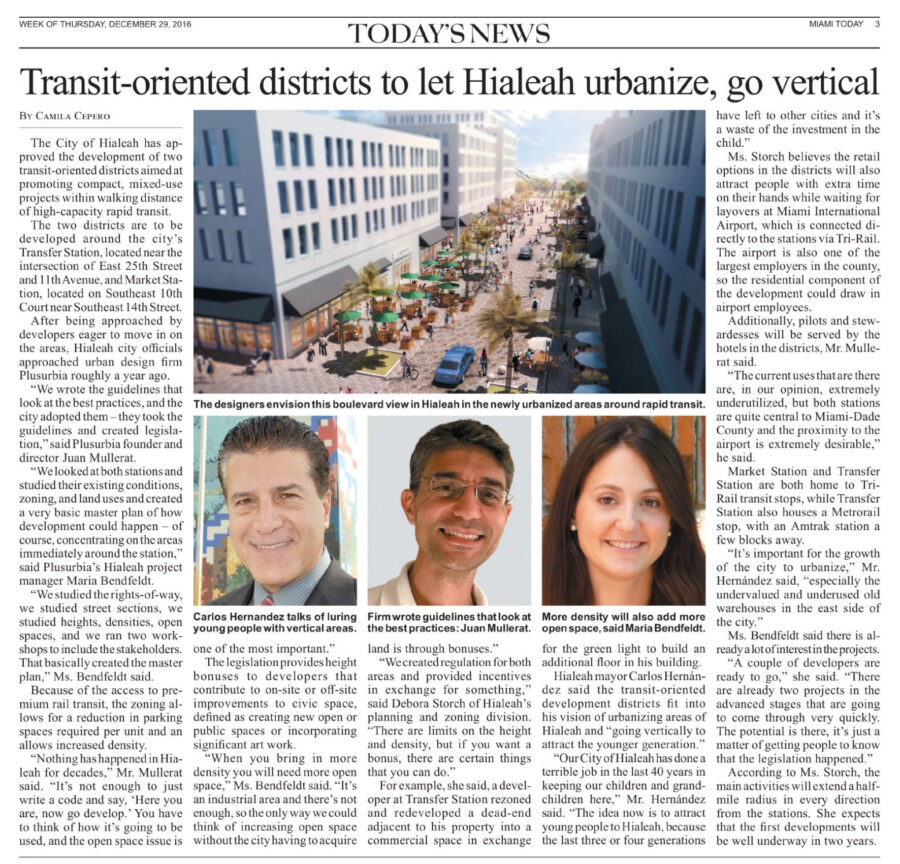 Oct 27, 2016, 1:57pm EDTBrian BandellSenior Reporter South Florida Business Journal The Hialeah City Council gave final approval to two new transit-oriented development areas on Oct. 25, with about 313 acres zoned for more density and uses that promote both pedestrian traffic and public transportation.The city hopes the rezoning will transform the heavily industrial area around its two Tri-Rail stations into mixed-use communities with housing for workers and vibrant open spaces. Miami-based PlusUrbia, firm that designed the neighborhood plan in Miami’s Wynwood as it has gone from industrial to mixed use, also crafted the TOD and complete streets plan for Hialeah.“Hialeah has always been seen as a suburban city away from the core of Miami-Dade County,” PlusUrbia Design Director Juan Mullerat said. “Hialeah is interested in developing their city in a walkable manner. The smartest way to do this is to use the transit corridor to take advantage of its proximity to the airport. These are two of the best-connected areas for transit in the whole county.”The rezoning centers around Hialeah Market Station, at 1200 S.E. 11th Ave. – with a Tri-Rail station only one stop north of the station that connects with Miami International Airport – and Tri-Rail/Metrorail Transfer Station, at 1125 E. 25th St., where both systems connect. The Metrorail line continues south to the Health District, downtown Miami, Coral Gables and Dadeland. The Tri-Rail line extends north into Broward and Palm Beach counties.There’s also an Amtrak station nearby that carries passengers to New York.Multiple transit-orient developments have been proposed at the Metrorail stations further south, with apartments, hotels and offices, so local developers have bought into the TOD concept.Unlike Wynwood, which had an influx of artists, restaurants and retail before the city rezoned it, this area of Hialeah hasn’t seen much economic activity outside of warehousing in recent years. The question is whether the city can generate developer and resident interest in the new TODs.At least one developer is willing to try. The TOD process at Market Station started several years ago when Gerard Keating, who owns about 20 acres in the area, hired Zyscovich Architects to create a zoning plan for the area and present it to the city. He hoped that this plan would give his property greater density so he could build a mixed-use project.Hialeah officials weren’t ready to approve the plan at the time. So the city hired PlusUrbia to work with its planning and zoning officials and create a TOD and complete streets plan for both Market Station and Transfer Station. The new zoning applies to areas of 142 and 171 acres, respectively.Maria Bendfeldt, the project designer at PlusUrbia, said the TOD zoning encourages developers to create open space, public amenities and improve pedestrian right-of-ways in exchange for greater height. The goal is to have community gathering spaces, wide sidewalks and bike paths, and decorative medians. In some cases, pedestrians and cars would share the streets.The areas of each TOD are divided into three density levels: high-rise, mid-rise and low-rise.The high-rise areas are zoned 125 units per acre and up to 12 stories, if developers purchase an additional three stories of height. However, directly along the train tracks, developers could build up to 15 stories.The mid-rise areas are zoned for a minimum of 25 units per acre up to 125 units per acre and up to eight stories, with the purchase of three additional stories.Finally, the low-rise areas are zoned for up to 35 units per acre and no more than three stories.In the Market Station area, the high-rise zoning runs down Southeast Ninth Terrace and Southeast 10th Court from Southeast Eighth Street to Southeast 14th Street. In the Transfer Station area, the high-rise area is along East 25th Street between East Eighth Avenue and Northwest 37th Avenue, plus along East 11th Avenue from East 28th Street to East 23rd Street.Bendfeldt said that all buildings must have ground-floor retail to activate the street. Other types of commercial development would also be permitted in the buildings, she added.PlusUrbia worked with the city to reduce parking requirements for the area to encourage public transit and make the units more affordable, Bendfeldt said. The TOD zoning requires one space for each one-bedroom unit, generally under 650 square feet, and 1.5 spaces for larger units. However, the developer could reduce the parking requirement by a half-space per unit by paying into a TOD area parking fund. Bendfeldt said the city hopes to use these funds to build a public garage at some point.Bendfeldt said the new TODs are ideal locations for workforce housing because of their access to public transit that reaches major employment centers. There aren’t many affordable options left in the county, especially for young workers, she said.“As soon as you get two or three catalyst projects, you will get more interest in the area, either people trying to retrofit existing structures or building something new,” she said.Link to article: http://www.bizjournals.com/southflorida/news/2016/10/27/city-increases-density-on-313-acres-in-two-transit.html