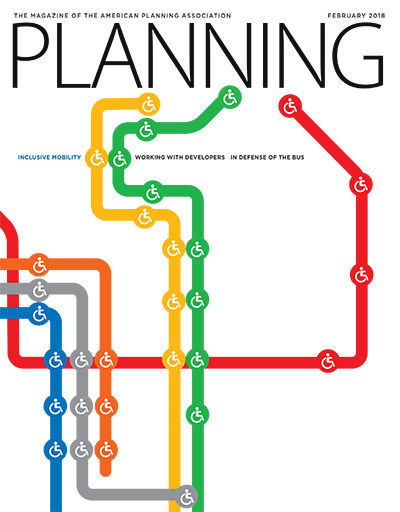 PlusUrbia Design Communications Leader Steve Wright, and his wife: Americans with Disabilities Act expert Heidi Johnson-Wright, co-authored the Planning Magazine February Cover story. Inclusive Mobility is the title of the article on applying Universal Design to every aspect of mobility – from complete streets to commuter rail to buses and safe sidewalks. The article interviewed a half dozen experts and shared best practices for delivering seamless barrier-free mobility to the nearly 57 million Americans who have some kind of disability.Planning, the publication of the American Planning Association, has previously published the Wright’s guide to better urban design of public spaces for people who use wheelchairs, canes, crutches, walkers and other assistive mobility devices. Johnson-Wright, an attorney by training and longtime advocate for people with disabilities, has used a wheelchair for her mobility for four decades. Wright, an award-winning journalist, blogs daily on urban design, travel, human rights and related issues at http://urbantravelandaccessibility.blogspot.com.Inclusive MobilityApplying universal design to how people get around.Illustration by Lana Gwinn; map source: WMATA. By Steve Wright and Heidi Johnson-Wright John Morris, a Florida-based travel writer (wheelchairtravel.org), uses a power wheelchair for mobility. He has explored the accessibility of dozens of public transit systems while on the road in both the U.S. and on four continents. He says that virtually every city in America has a long way to go before they truly offer inclusive mobility. "City planners often fail to recognize the true cost of accessibility barriers in transportation and movement. Just like our able-bodied counterparts, people with disabilities are on a schedule and have places to be: jobs, meetings, appointments, dinners, movies, concerts, sporting events, flights to catch, etc.," Morris says. "Barriers to accessibility disrupt freedom of movement and place additional hardships on those who use wheelchairs or other assistive devices."People with disabilities are a signification part of the population: Nearly 16 million Americans use wheelchairs, canes, crutches, or walkers. Millions more have vision, hearing, or cognitive disabilities that impact how they get around.Supporting the mobility of all people, regardless of ability, is arguably one of the most important urban planning issues facing public- and private-sector professionals.John Morris at the Amputee Coalition National Convention last August in Louisville, Kentucky. Photo courtesy Amputee Coalition.Embracing a new philosophyFrom the 1950s to recent times, mobility was largely defined by the ability to buy, finance, maintain, fuel, insure, and park an individual automobile. Outside of very large, older Eastern Seaboard cities, public transit was given second-class status and streets were designed to move more cars faster — sacrificing pedestrian and multimodal mobility.A huge shift in philosophy — to make life more affordable, accessible, and healthy — has begun to bring about a focus on universal design that aspires to give urban and suburban people who commute — by foot, by wheelchair, by bicycle, and by public transit — equal standing or priority over automobiles.This seismic shift can have a profound positive impact on people with disabilities. The complete streets movement, which embraces wider, well-maintained sidewalks; safe, well-marked crosswalks; more accessible bus stops; and better elevator access to underground or elevated commuter rail, also facilitates universal design, giving people of all abilities increased access to housing, jobs, civic opportunities, medical care, recreation, and more.But for the nearly 57 million Americans who have some kind of disability, challenges remain.Well-meaning designers who seek to activate the pedestrian realm with more plantings, decorative furniture, and sidewalk cafes sometimes block the wide, accessible path of travel needed for people who use wheelchairs for mobility.At times it's a simple lack of communication and coordination among the professional disciplines — planners, architects, traffic engineers, public works field staff, downtown development authorities, community reinvestment authorities, and private developers changing or designing rights-of-way.And then there are ride-share and transportation network companies, like Uber and Lyft. Many planners embrace these as one answer to both traffic congestion and the conundrum of getting people to and from transit — the so-called first and last mile. But these services are provided by independent contractors who typically drive sedans and SUVs, making few ride-share vehicles able to accommodate those who use power wheelchairs or other large motorized devices.Poorly designed sidewalk and crosswalk infrastructure make it more difficult for people with limited mobility. For example, a utility pole blocking the middle of a narrow sidewalk might not pose an issue for an able-bodied person, but a wheelchair user, a person with a walker, or a mom pushing a stroller would have to find another route, or walk in the street to get around the pole.Likewise, a pedestrian activation button on a raised sidewalk out of the ADA-accessible part of a curb ramp makes it nearly impossible for a wheelchair user to cross under the safety of the "walk" light. Photos courtesy Perils for Pedestrians, Pedestrians.org.Making transit inclusiveFor more than half a century, Los Angeles has been famous (some would say infamous) for being the most car-centric place in the Western world. That makes getting around a lot harder for people with disabilities. Accessible consumer van upgrades — adapting for lifts, ramps, safety tie-downs, and automated systems that allow for transfer from a wheelchair to the driver's seat — can cost upward of $75,000, and thousands more per year to fuel, maintain, insure, and park.But all of that is changing with 