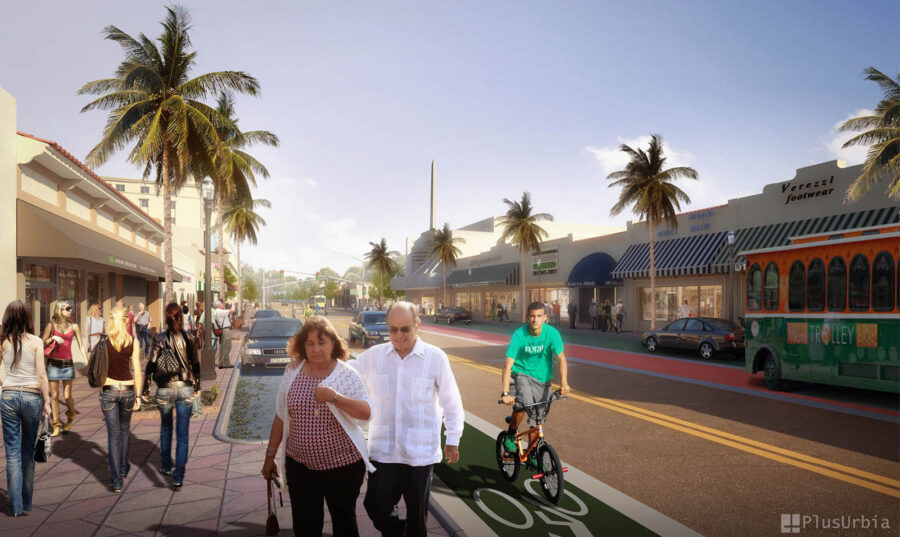 By PlusUrbia Design //From the beginning of urbanized America, streets functioned to provide mobility in many ways:People walked to work, trolley, horse-drawn then powered moved workers from factories and offices to home. Trains played a role in commutes. Bicycles incited a pedal power mobility craze for a while.Then the automobile came along.By the 1950s, roads became the sole domain of automobilesThe automotive industry even created the term “jay walking” and launched a campaign to demonize people on foot.Sidewalks shrunk and beautifully landscaped medians were torn out to create more lanes for automobiles.Trolley lines were ripped out and replaced with buses. But buses were devalued and branded as last ditch transportation for the unfortunate. Only the sedan was fit for the upwardly mobile middle class American.Crosswalks were diminished. Those brazen enough to move around on two feet were seen as merely an impediment to moving more cars faster.Government loans encouraged suburban single family homebuilding, giving rise to the super highway, and when highways weren’t enough, surface streets – even the most picturesque and historic – were overhauled to turn them into another layer of de facto highways.After a half century of destroying hundreds of urban corridors for the sake of the almighty automobile, sanity started to creep bank into the minds of elected officials, town planners and constituents.Milwaukee, San Francisco and other major cities razed elevated highways that had torn apart their urban fabric. Boston paid billions to put its in-town highway underground, with acres of urban park space and connectivity built above.Miami, which consistently/tragically ranks near the top of annual lists of the most deadly cities for pedestrians in America, is slow to offer options for pedestrians, bicyclists, public transit riders, wheelchair users and others who do not wish to be beholden the automobile.Construction for I-95 tore apart the city’s historic community. Car dependence reigns supreme despite tens of thousands of dwelling units being built in what should be a walkable urban core. Because Miami grew up in the car age, its commute times are among the longest in America.Something has to give.Miami’s PlusUrbia Design, a design practice dedicated to creating better places, is trying to undo car culture chaos in its hometown.  The studio, known for its acclaimed Wynwood Neighborhood Revitalization District plan, is working to save Miami’s best-known street.Calle Ocho, the heart of Little Havana, functions as a high-speed highway into Downtown Miami and Brickell, its financial district. Two PlusUrbia team members, who each live in historic homes just blocks from Calle Ocho, have dubbed the dangerous road “Highway Ocho.”For half a century, Calle Ocho (SW 8th Street) has served as an eastbound speedway for commuters, along with the equally dangerous one-way, three-lane, westbound SW 7thStreet. It is time to make streets for the people, not simply for cars.Originally a two-way typical American main street, Calle 8 was transformed in the late 60s into commuter highway.  A few years later, the nearby Dolphin Expressway (I-836) was completed.Despite the opening of an elevated east-west speedway into downtown, Calle Ocho’s prime stretch between 27th Avenue and I-95 was never converted back into the quaint main commercial core of Little Havana.Plusurbia Design proposes to turn Calle 8 back to its original, main street self.  The firm’s calmed traffic and wider sidewalks would reverse 50 years of degraded neighborhoods and commerce left in the wake of a corridor turned freeway.PlusUrbia advocates for Calle Ocho as a destination, not as a pass-through corridor scarring one of the oldest, most authentic neighborhoods left in Miami.The Florida Department of Transportation is currently studying the SW 7th and SW 8th Street corridors.  Early Little Havana community meetings have shared FDOT scenarios that seem to be more concerned with vehicle movement than people movement.By early 2016, the state transportation agency will pick a team of consultants to conduct a $2 million study and redesign of the corridor.  PlusUrbia, which has committed 500 staff hours to its pro-bono redesign effort, was approached by major engineering firms to serve as a consultant for the SW 7th and SW 8th project. However, the studio has turned down those opportunities to better serve the public interest.PlusUrbia, with strong ties to Little Havana, wants to unlock Calle 8’s potential by proposing the restoration of the original two-way traffic. The Miami-based urban design firm has created images of a 21st century Calle Ocho with multimodal transportation alternatives such as dedicated bike and transit lanes, comfortable wide sidewalks and additional safe crosswalks in a vibrant urban setting. More than 100 Little Havana stakeholders attended PlusUrbia’s October forum to share a vision for a better Calle Ocho. A diverse group of urban and transportation design experts worked interactively with the audience to empower the growing grass roots movement for calmed traffic and a better pedestrian experience on SW 7th and SW 8th streets. The overwhelming opinion of those in attendance, including three elected officials, is that Calle Ocho and SW 7th must be Complete Streets that serve pedestrians, cyclists and public transit equally with automobiles.PlusUrbia’s designers firmly believe Calle 8 should be for all Miamians to enjoy, not only to drive through.  Its pro-bono effort believes popular opinion will rescue SW 8th Street from half a century of destruction as “Highway Ocho”.From its office, on a bike lane footsteps from a commuter train station, PlusUrbia hopes to export its Calle Ocho campaign nationwide. The firm believes democratic streets – that treat pedestrians, cyclists, transit riders and automobiles equally – will benefit every urban c